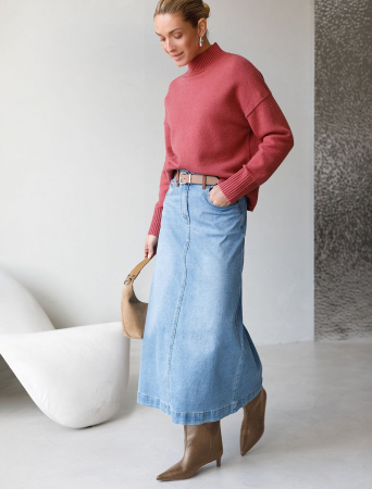 Юбка А-силуэта выполнена из эластичного денима. Модель средней посадки с декоративными потёртостями и пятью карманами как у джинс. Подходит для любого типа фигуры. Сочетается с открытой обувью, кроссовками и сапогами. Изделие дополнено фирменным патчем.