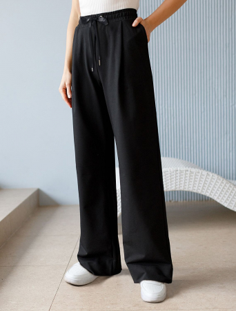 Брюки свободного кроя выполнены из эластичного футера-двухнитки. Модель дополнена защипами и боковыми карманами как у классических брюк и одним задним карманом. Эластичный пояс на резинке с шнурком из репсовой ленты и металлической фурнитурой. Брюки сочетаются в костюме с любым верхом из футера в черном цвете.