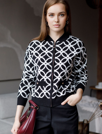 Бомбер жаккардовой вязки выполнен из нежной пряжи на основе вискозы с добавлением кашемира. Мягкая модель с золотистой фурнитурой не раздражает кожу, приятно ощущается на теле и поддерживает комфортный микроклимат. Совет стилиста: трендовая модель эффектно впишется в сдержанный образ, добавив образу выразительности. Сочетайте с однотонными брюками, юбкой, платьем или джинсами
