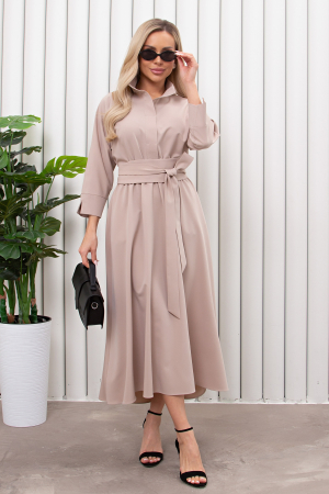 Элегантное платье приталенного силуэта выполнено из плательно-костюмной ткани. Горловина оформлена мягким отложным воротником, переходящим в планку с фиксированной застежкой. Цельнокроенный рукав длиной 3/4 оформлен фигурной притачной манжетой. Модель отрезная по линии талии, присобрана на эластичную резинку. Расклешенная юбка-миди, в боковых швах функциональные карманы. Низ ассиметричный. Линию талии дополнительно подчеркивает пояс-кушак.