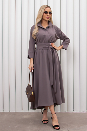 Элегантное платье приталенного силуэта выполнено из плательно-костюмной ткани. Горловина оформлена мягким отложным воротником, переходящим в планку с фиксированной застежкой. Цельнокроенный рукав длиной 3/4 оформлен фигурной притачной манжетой. Модель отрезная по линии талии, присобрана на эластичную резинку. Расклешенная юбка-миди, в боковых швах функциональные карманы. Низ ассиметричный. Линию талии дополнительно подчеркивает пояс-кушак.