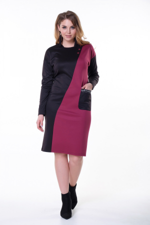 Изысканное платье полуприлегающего силуэта, комбинированное двумя цветами трикотажа. Круглая горловина на обтачке. Втачной длинный рукав на основе спущенного плеча. По переду модель дополнена функциональным накладным карманом. По левому плечу имитация застежки на пуговицы. В среднем шве спинки заложена застежка на молнию. Низ ровный, сзади разрез.