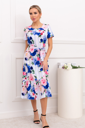 Красивое летнее платье полуприлегающего силуэта из легкой ткани с оригинальным цветочным принтом. Горловина круглая на обтачке. Короткий втачной рукав. В среднем шве спинки расположена застежка на петлю и пуговицу. По низу платья расположена широкая оборка. Пояс в комплекте. Итальянский принт. Принт купонный - расположение рисунка может меняться.