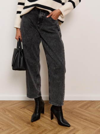 Джинсы Barrel (Бочка) - тренд сезона! Укороченные джинсы модного кроя Barrel с вытачками на коленях создают идеальный объемный силуэт "бочонка" - широкие в бедрах и плавно сужающиеся к низу. Это создает современный и очень стильный геометрический образ. Вытачки в области колена по внутреннему шву не просто являются дизайнерской изюминкой, но и дополнительно подчеркивают требуемый силуэт бочонка и обеспечивают идеальную посадку по ноге, сохраняя форму джинсов при движении. Укороченная длина "анкл" (ankle-length) визуально делает образ легче и современнее и идеально подходит для создания настроения легкой небрежности. Изготовлены из черного денима. Специальная стирка towel wash позволяет получить особый винтажный вид ткани с легким мраморным эффектом. Эта модель - идеальная пара для современных стильных и смелых образов.
