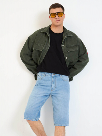 Мужские классические джинсовые шорты с пятью карманами. Посадка Regular fit (полуоблегающие по бедру), Средняя талия спереди и высокая сзади, немного зауженные к низу.Застежка на молнии. Выполнены из традиционной хлопковой ткани denim. Светлая стирка со слабовыраженными потёртостями спереди и сзади.