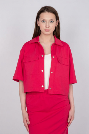 Джемпер женский свободный кроя, со спущенной линией плеча. Горловина круглая обработана классическим воротником с цельнокроенной стойкой из основного полотна. Линия борта обработана подбортом. На полочке отрезная кокетка и накладные карманы с необработанными краем. Вход в карман прорезной. Низ рукава и низ изделия не обработан. Модель рассчитана на рост 164-170