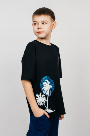 Футболка для мальчика свободного силуэта (оверсайз) с коротким рукавом. Горловина круглая, обработана воротником из рибаны. Низ изделия и рукава обработан швом вподгибку. На полочке принт шелкография. Надпись переводится как Под пальмой.