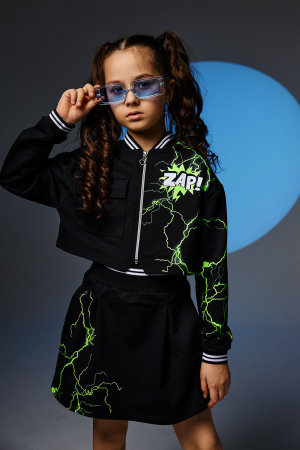 Стильный детский костюм состоит из бомбера и юбки с ярким принтом.