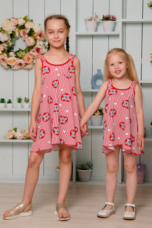 Сарафан детский летний, свободного силуэта с завышенной линией талии. Бретели выполнены из основной ткани собранной на тонкую резинку. Низ изделия обработан декоративной краеобметочной строчкой.