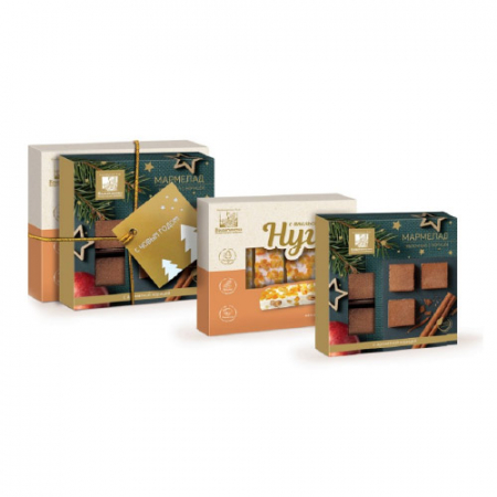 Новогодний набор3 (Нуга с апельсином 140/мармелад яблочный с корицей 110г) состоит из двух красивых коробочек со сладостями: