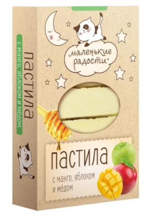 Состав: сахар, пюре яблочное, патока, плодовый наполнитель манго (манго, сахар, овсяная клетчатка), мёд натуральный, агар-агар (натруальный стабилизатор), белок яичный сухой, лимонная кислота (регулятор кислотности)