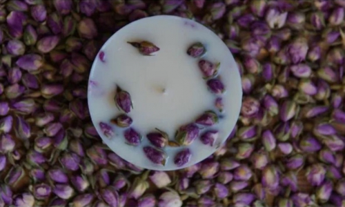 Из оливкового и соевого воска с натуральными элементами декора (апельсин, корица, бадьян, веточки туи, бутоны роз).