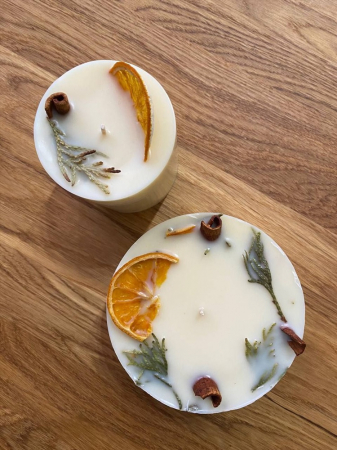Из оливкового и соевого воска с натуральными элементами декора (апельсин, корица, бадьян, веточки туи, бутоны роз).