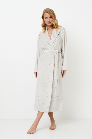 Представляем вашему вниманию халат Meredith - ваш билет к блаженному комфорту и стилю. Этот халат длиной ниже колена из мягкой ткани серого цвета, украшенной изящными звездочками, окутывает вас и дарит уют. В нем есть пояс на талии и удобные карманы, поэтому он так же полезен, как и уютен. Приготовьтесь к стильному отдыху в халате Meredith, который станет вашим идеальным спутником в моменты расслабления.