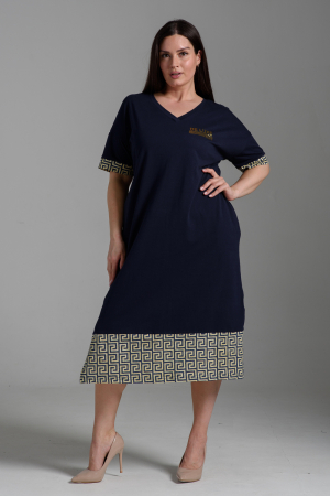 Платье прямого силуэта, с V-образной горловиной, с карманами в боковых швах. Рукав короткий, с манжетом из отделочной ткани. Низ полочки завершен деталью из отделочного полотна. В нижней части боковых швов обработаны разрезы. Горловина обработана обтачкой из основного полотна.