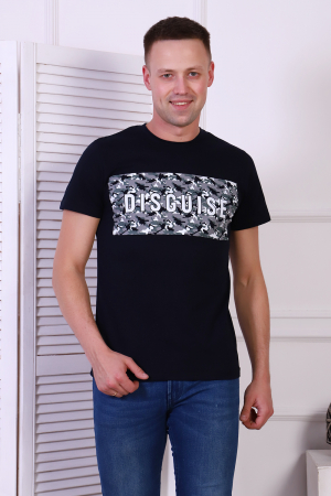 Футболка из трикотажной хлопковой кулирки. На полочке контрастный принт с камуфляжным рисунком и надписью, рукава короткие.
