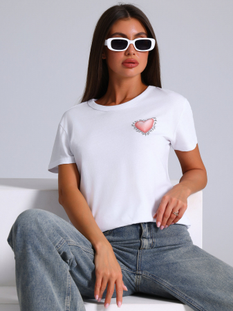 Женская футболка выполнена из кулира - легкого хлопкового полотна. Изделие свободного покроя с короткими рукавами и круглым вырезом горловины, украшено аппликацией. Уход: только машинная стирка (руками не стирать!) при температуре 40 градусов, без предварительного замачивания. Изделия с печатью перед стиркой необходимо вывернуть на изнаночную сторону.