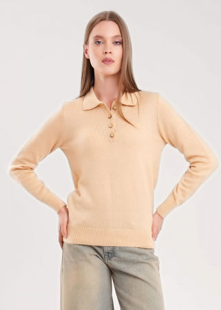 Вязаный джемпер умеренного объема из акриловой пряжи с добавлением шерсти, переплетение гладь. Втачной длинный рукав, по горловине отложной воротник с функциональной планкой и пуговицами. По низу изделия и рукавов манжеты.