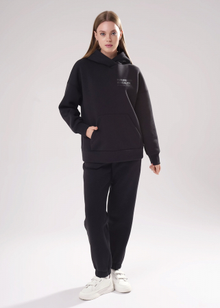Джемпер спортивный свободного силуэта из трикотажного полотна футер с начесом, с капюшоном на подкладе. Длинный рукав со спущенной линией плеча. По низу рукава и изделия манжеты. Спереди вверху принт, внизу карман кенгуру.