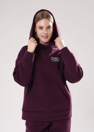 Джемпер спортивный свободного силуэта из трикотажного полотна футер с начесом, с капюшоном на подкладе. Длинный рукав со спущенной линией плеча. По низу рукава и изделия манжеты. Спереди вверху принт, внизу карман кенгуру.