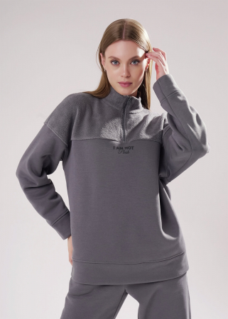 Джемпер спортивный свободного силуэта из трикотажного полотна футер с начесом "тедди". По горловине стойка с молнией. Спереди и по спинке кокетка наизнанку. Длинный рукав со спущенной линией плеча, по низу манжет. Внизу изделия притачной пояс.