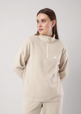 Джемпер спортивный прямого силуэта из трикотажного полотна флис. По горловине стойка с молнией. Спереди рельефы. Длинный рукав со спущенной линией плеча. По низу рукава и низа изделия окантовка. Спереди вышивка.