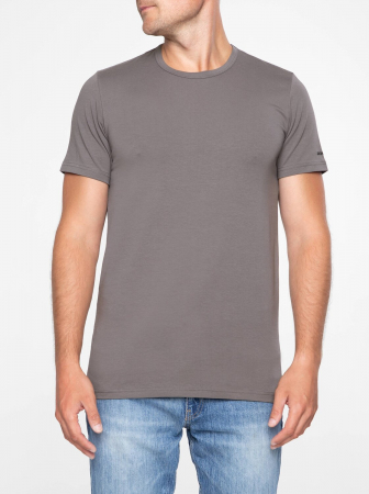 Фуфайка мужская из однотонного полотна, с коротким втачным рукавом. Круглый вырез горловины обработан бейкой.