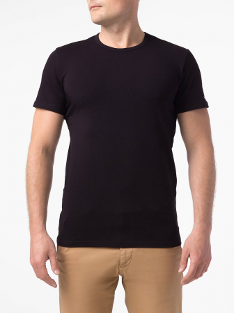 Фуфайка мужская из однотонного полотна, с коротким втачным рукавом. Круглый вырез горловины обработан бейкой.
