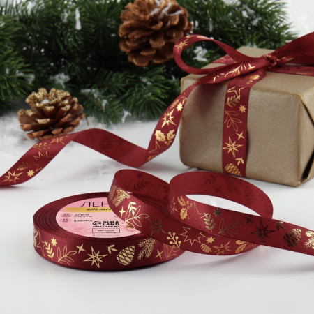 Лента атласная с тиснением «Рождественское чудо», 15 мм, 23±1 м, бордовая (арт. 9561239)