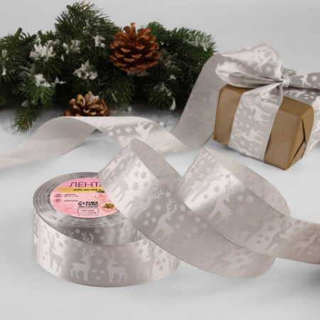 Лента атласная «Олени», 40 мм, 23±1 м, серебряная (арт. 4937928)