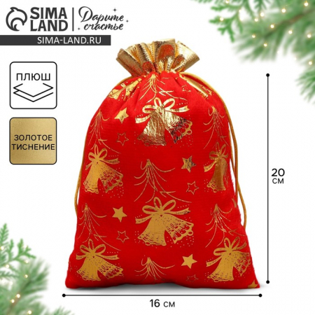 Мешочек подарочный новогодний плюш «Золотые фейерверки», колокольчики, тиснение, 16?24 см ± 1.5 см (арт. 9717642)