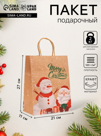 Пакет бумажный подарочный новогодний крафт «Снеговик», 27?21?11 см (арт. 10500672)
