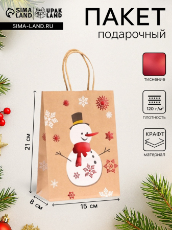 Пакет бумажный подарочный новогодний крафт с тиснением«Снеговик», 15?21?8 см (арт. 10500643)