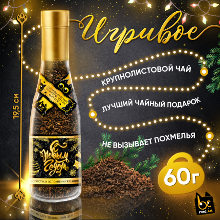 Одна из первых новогодних ассоциаций это, конечно, шампанское! Но оно же только для взрослых, да и на работе не выпьешь! А нам хочется, чтоб новогоднее настроение дарили всем! Поэтому, ароматнейший крупнолистовой чёрный чай мы упаковали в бутылку, которая напоминает бутылочку игристого! Получился игривый согревающий новогодний подарок, который подарит массу положительных эмоций получателю.