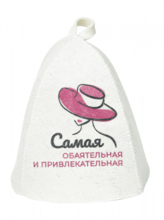 Шапка для бани "Самая обаятельная и привлекательная" сделана из белого войлока и украшена оригинальным ярким принтом.