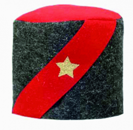 Шапка для бани "Папаха" сделана из серого войлока в форме турецкой фески и украшена аппликацией в виде наклонной красной ленты.
