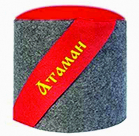 Шапка для бани "Папаха" сделана из серого войлока в форме турецкой фески и украшена аппликацией в виде наклонной красной ленты.