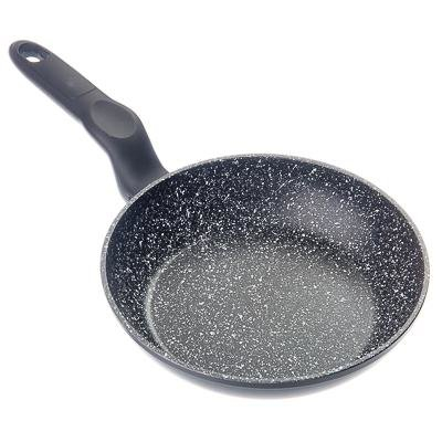 Сковорода диаметром 20 см из литого алюминия с каменным антипригарным покрытием черно-белого цвета, с бакелитовой черной ручкой с покрытием "софт-тач" эргономичной формы и с петлей для подвешивания, с индукционным дном - подходит для использования на всех видах плит, включая индукцию.