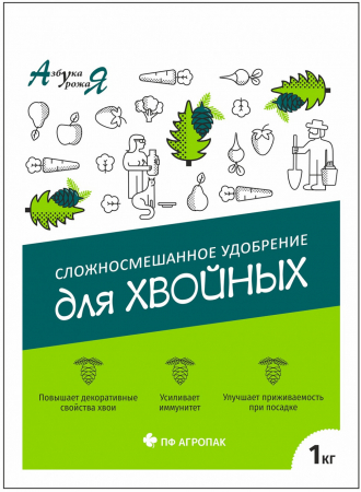 Удобрение марки “АЗБУКА УРОЖАЯ. ХВОЙНОЕ” – полное удобрение, содержит азот, фосфор и калий, предназначено для основной заправки почвы и подкормки хвойных деревьев и кустарников: можжевельник, туя, ель, сосна, пихта и др.