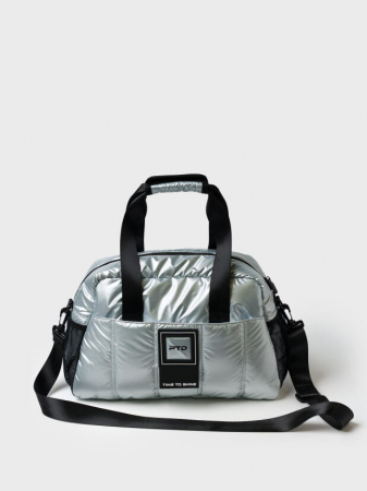 Модная спортивная сумка из серебристой дутой плащевой ткани для девочки подростка. Сумка имеет одно большое отделение с сеткой разделителем и карманом на молнии внутри. Снаружи есть большой карман на кнопке с одной сторону и с другой стороны большой карман на молнии, сбоку имеются карманы из сетки на резинке. Ручки с удобным креплением, плечевой регулируемый ремень. Сумка очень легкая и вместительная. К сумке можно подобрать рюкзак в едином дизайне. Размер мешка 37*32*14 см