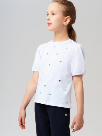 Белая нарядная школьная блузка с коротким рукавом для девочки подростка от PlayToday — идеальный выбор для торжественных событий и каждого учебного дня. Лёгкая трикотажная подростковая блузка с изысканным декором создаёт праздничное настроение и дарит комфорт на весь день.