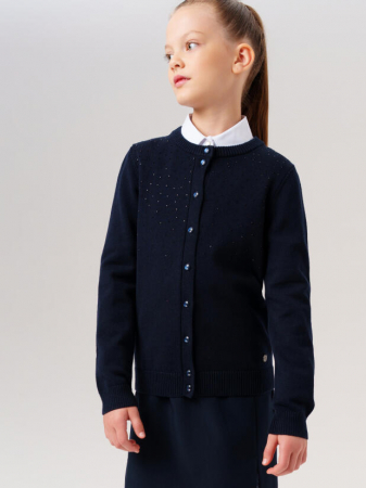 Классический синий трикотажный школьный кардиган на пуговицах для девочки подростка от PlayToday — элегантная и практичная вещь для школы и повседневной носки. Украшенный деликатным декором из страз в тон ткани, он придаёт образу изящность, оставаясь в рамках школьного дресс-кода.