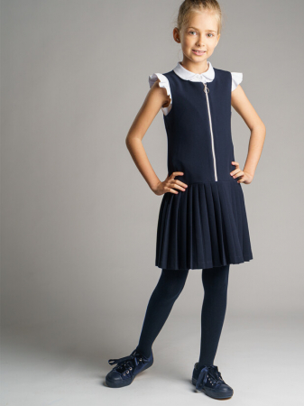 Школьный текстильный сарафан для девочки подростка. Синее платье А-силуэта идеально в школу. Платье для школы выполнено из ткани с технологией non-iron, которая не требует глажки после стирки. Спереди платье для школьницы имеет застежку на молнию.