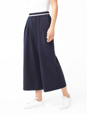 Свободные брюки прямого силуэта выполнены из эластичного футера двухнитки. Длина изделия до щиколотки. В боковых швах расположены карманы. Внутренняя часть кармана из тонкого хлопка в тон полотна. Модель дополнена эластичным поясом, с контрастной полосой и золотистым логотипом бренда. Сочетается в костюме с джемпером D49.083 и D49.086. Правила ухода: использовать жидкое моющее средство (гель для стирки), добавлять к нему кислородный пятновыводитель для цветных вещей, и салфетки (защита от окрашивания). Стирка при 30 градусах, отжим на максимальных оборотах.