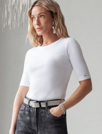 Футболка выполнена из трикотажа в широкий рубчик. Базовая модель с круглым вырезом и рукавом до локтя. Эластичный хлопковый трикотаж сидит по фигуре, не сковывает движений и очень комфортный в носке. Фактура вертикальных полос визуально стройнит и вытягивает силуэт. Базовое изделие хорошо впишется в любой гардероб. Идеально подходит для многослойных образов в базовый гардероб.