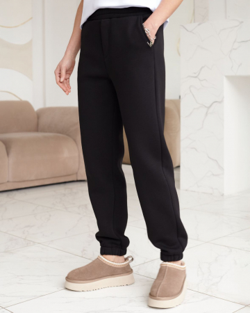 Эти уютные брюки черного цвета созданы для вашего комфорта. Стильные спортивные штаны из натурального материала и правильного кроя подойдут для девушек и женщин любого размера, в том числе на плюс-сайз фигуру. Зауженные к низу брюки отлично вытянут силуэт и скроют недостатки за счет правильного кроя.