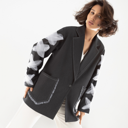 Этот жакет — воплощение элегантности и неповторимого стиля. Его свободный крой обеспечивает комфорт и свободу движений, что делает его идеальным выбором для динамичных и уверенных в себе личностей. Однобортный дизайн с лацканами и объемный пришитый декор по всей длине рукавов придают изделию ультрасовременный вид. Каждый элемент этого жакета — от выбора ткани, как тиар, атлас и фатин, до уникального принта на спине — делает его настоящим произведением искусства. Приобретение этого жакета оптом — это не только удачное деловое решение, но и возможность подарить вашим клиентам уникальную вещь, которая подчеркнёт их индивидуальность.