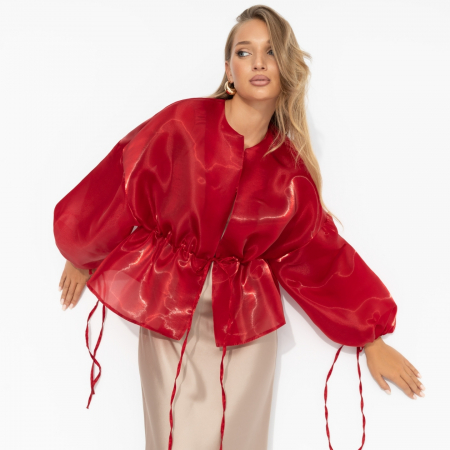 Жакет ЧАРУТТИ мгновенно приковывает внимание смелым цветом, символизирующим силу и страсть. Объемные рукава создают мощный и выразительный силуэт, подчеркивающий индивидуальность. Жакет создан для уверенных в себе женщин, которые гордо несут свою уникальность. Жакет объемного кроя. Есть регулируемая кулиска на талии. Линия плеча спущена. Есть шнуровка по манжетам. Материал изделия слегка просвечивает.