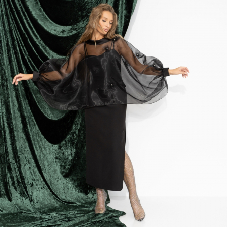 В каждой из нас живёт немного ночи. Органза нежно окутывает плечи, создавая ауру тайны. Свет скользит по ткани, как взгляд, и задерживается дольше...что скрывает эта ночь? Болеро полупрозрачное из органзы с объёмным декором. Отлично сочетается с платьем-комбинацией.