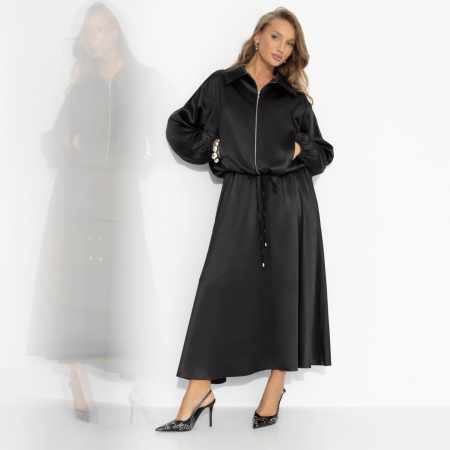 Поздний вечер, огни витрин мелькают в окне такси, и город кажется немного волшебным. Свободный бомбер на молнии, с кулиской по низу, и эффектная юбка с поясом-резинкой образуют стильный дуэт. Черный атлас красиво струится при движении. Носи вместе – или по отдельности, создавая каждый раз новую историю о себе. Комплект из бомбера и юбки. Оба изделия с карманами.